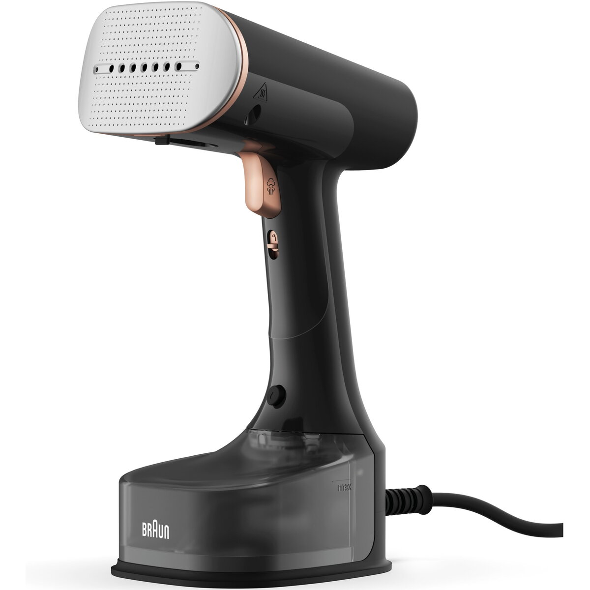 Aparat de calcat vertical cu abur Braun S7077BK 0X13810102, 1600W, abur variabil 35 g/min, rezervor detasabil 250 ml, sistem ActiClean Easy, talpa ceramica Dual FreeGlide 3D, incalzire rapida 35 sec, perie pentru tesaturi groase, Negru