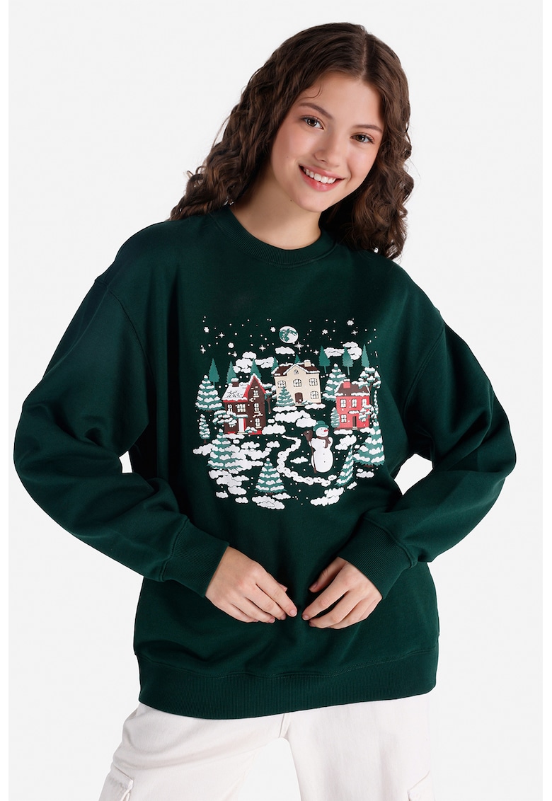 Bluza de trening cu decolteu la baza gatului si maneci cazute - Verde englez