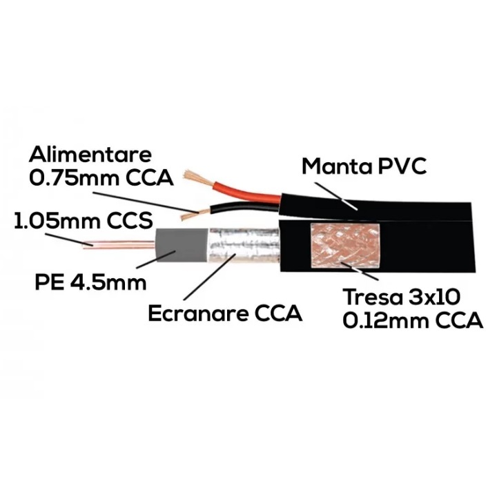 Cablu coaxial 75 ohm RG6 CCS + ALIMENTARE 2 fire CCA x 0,75 mm PE negru TED Electric rola 305 metri