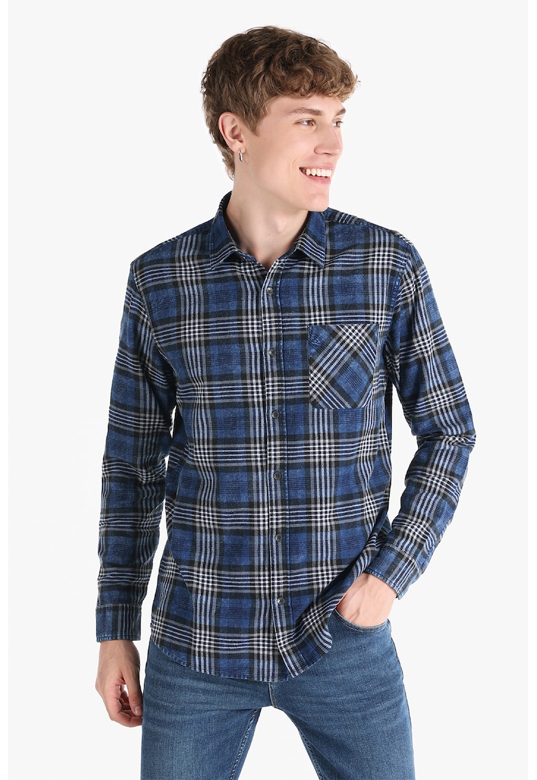 Camasa cu maneci lungi si model in carouri - Alb/Negru/Albastru inchis