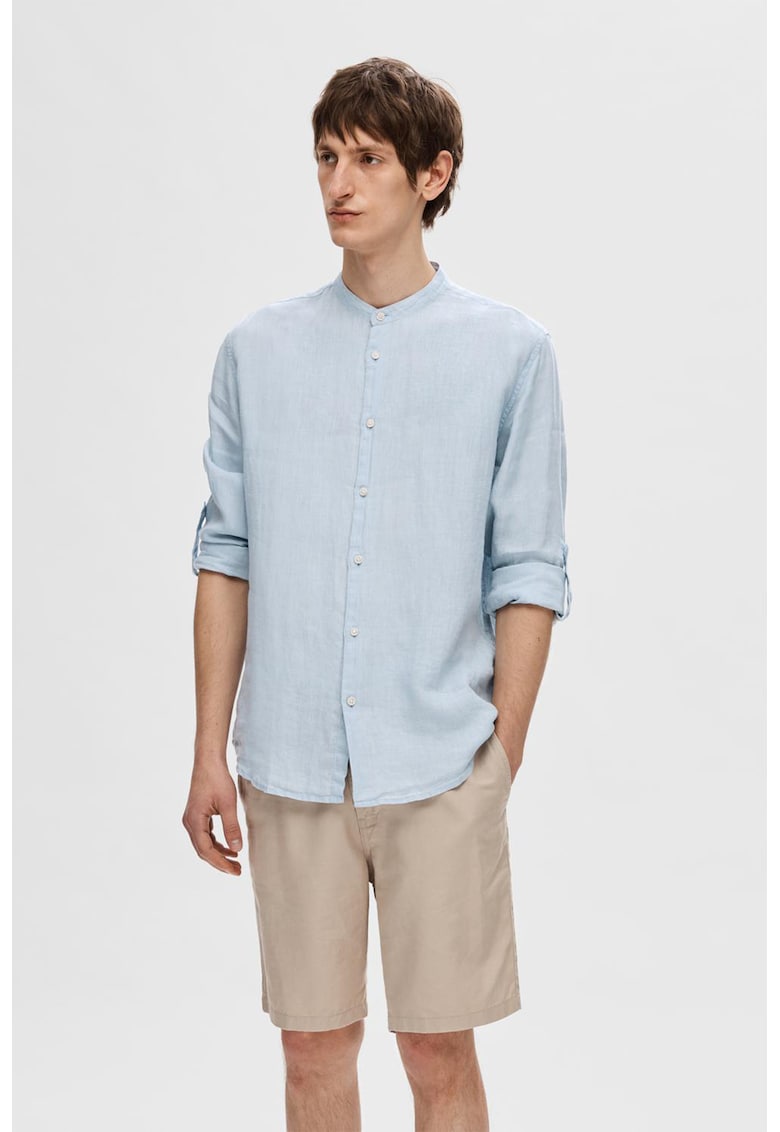 Camasa din in cu guler Mao - Albastru azur