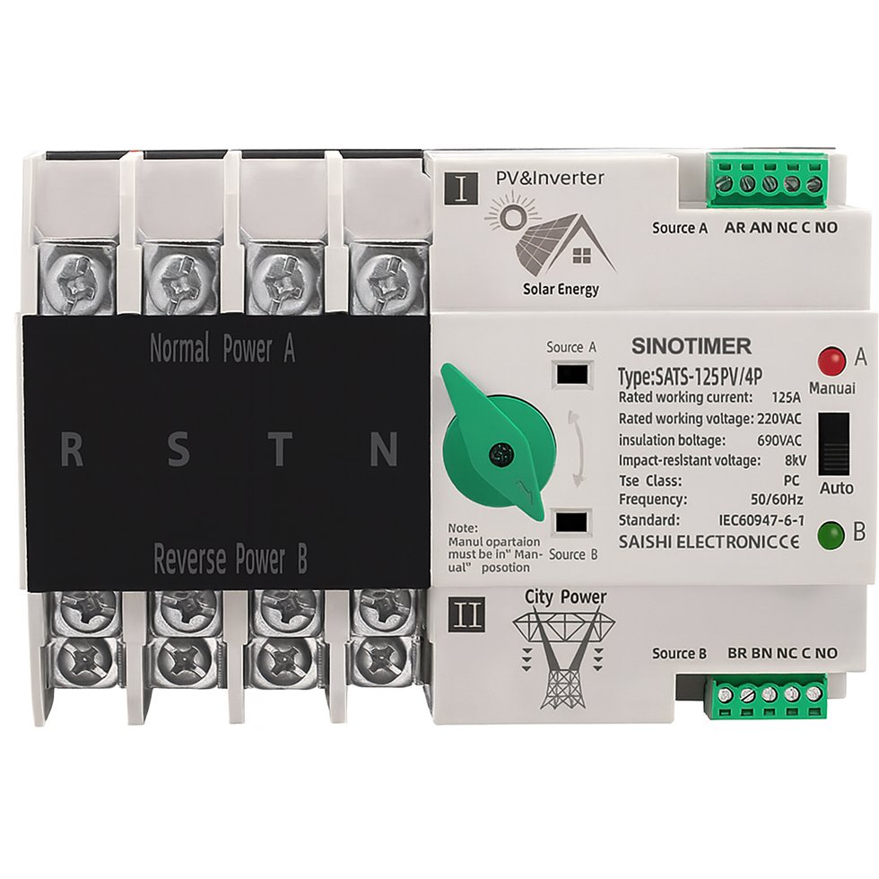 Comutator de transfer, PV, 4P cu sina DIN, SINOTIMER, comutatoare de selectie automata de transfer cu dubla alimentare, 125A SATS-125PV/4P