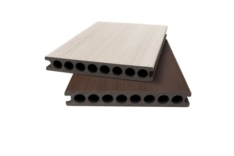 Deck 3D cu 2 fete din WPC 143x23mm L 3800mm Structura cu Gol Rotund pentru Rezistenta Sporita o fata maro o fata gri desch