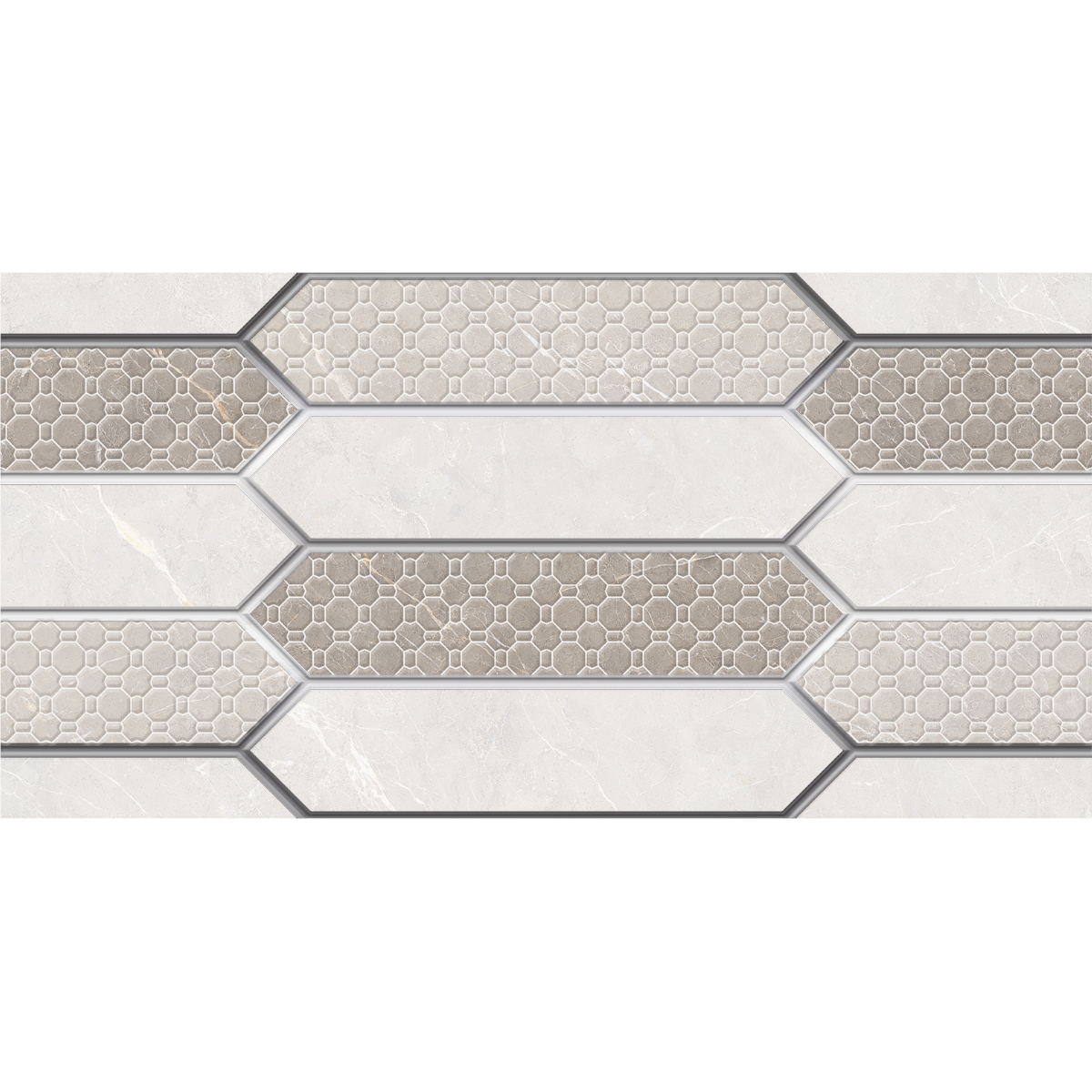 Faianta decorativa Fresno HL 22183-RM-2, glazurata, rectificata, lucios, model geometric in relief, insertii metalice, bej si crem 30 x 60 cm