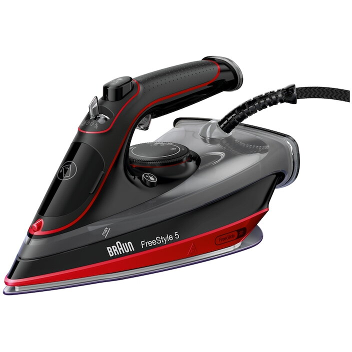 Fier de calcat Braun FreeStyle 5 SI5057RD, 2700W, jet de abur 220g/min, abur variabil 0-50 g/min, talpa SuperCeramic, rezervor 300 ml, tehnologie FreeGlide, oprire automata, sistem antipicurare, negru/rosu