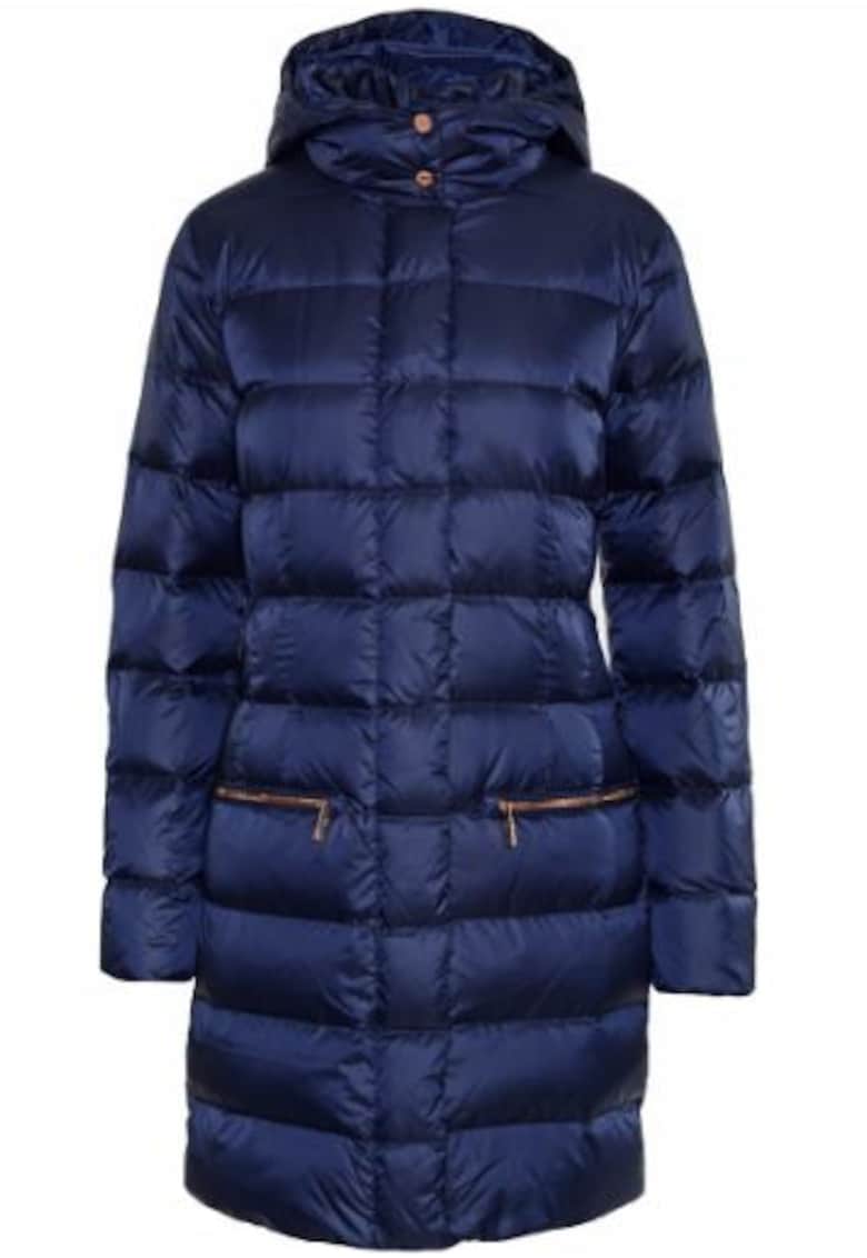 Geaca lunga cu gluga si umplutura din puf si pene - Bleumarin