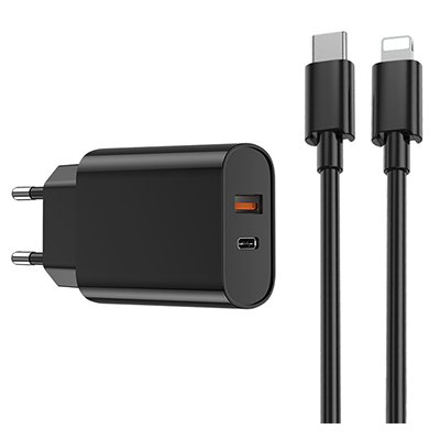 Incarcator retea USB + USB-C PD qc 20W + cablu lightning -NEGRU Wiwu GSM179558