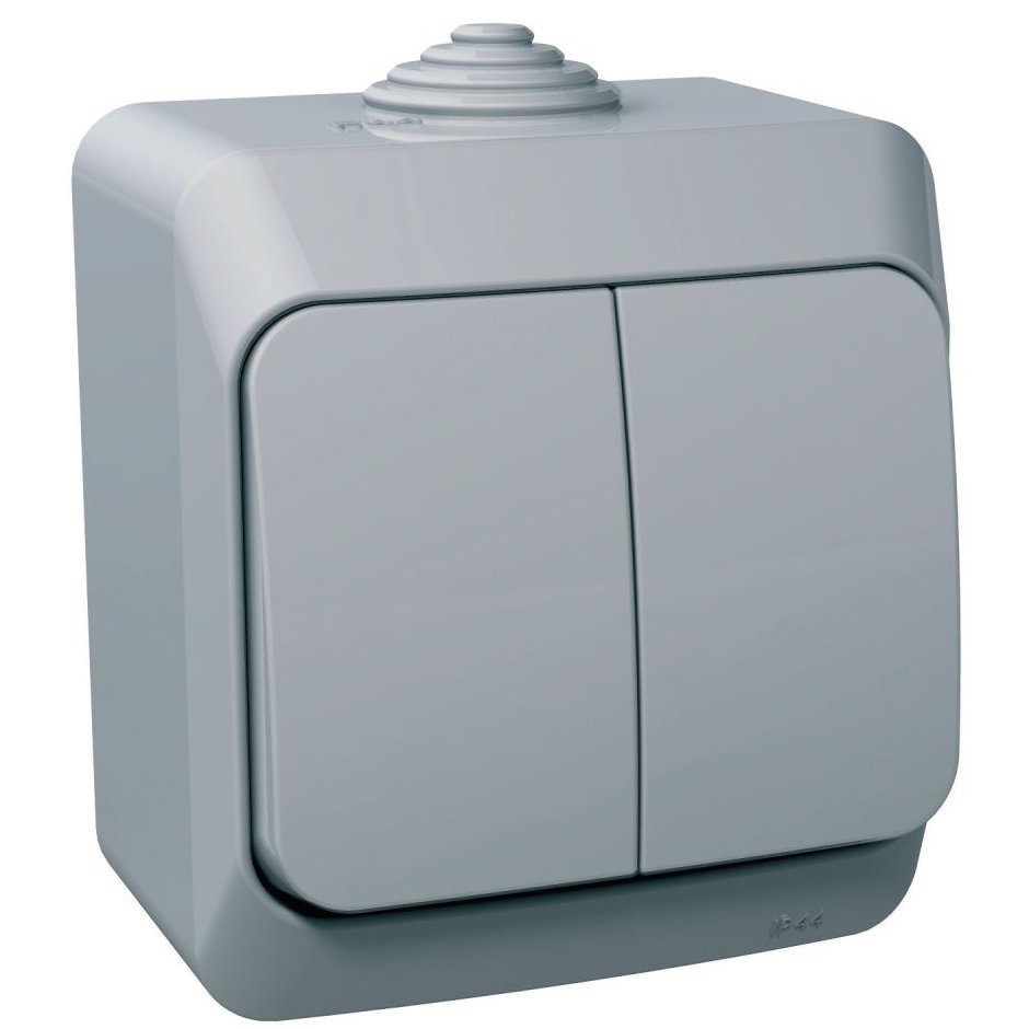 Tip produs: Intrerupator dublu Culoare: gri Curent nominal: 16A Grad de protectie: IP44 Latime: 66mm Inaltime: 79mm Material: Pa6 Gama de produse: CED