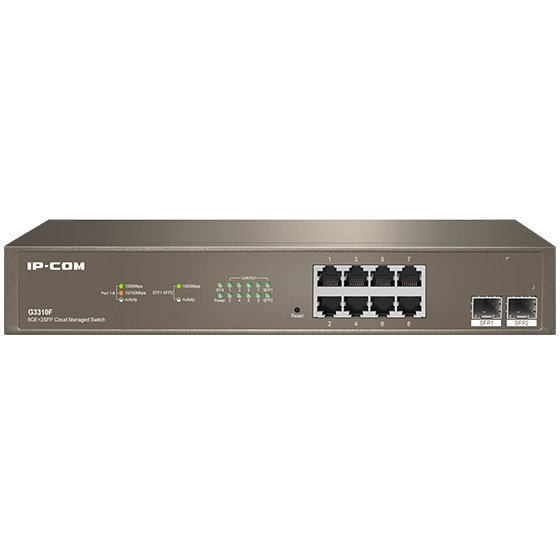 IP-COM 10-Port Gigabit Ethernet managed switch, G3310F; Network standard: IEEE 802.3, IEEE 802.3u, IEEE 802.3ab, IEEE 802.3x, IEEE 802.3z, and IEEE 80