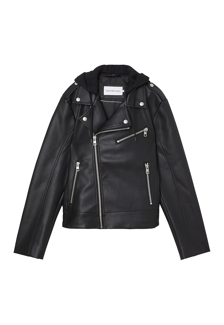 Jacheta biker de piele ecologica cu gluga - Negru