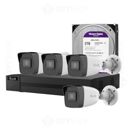 Kit supraveghere video IP de exterior,complet, Hikvision HiLook HI-NK-4288B, 4 camere, 2.8 mm, 4K, IR 30 m, PoE, HDD 2TB inclus