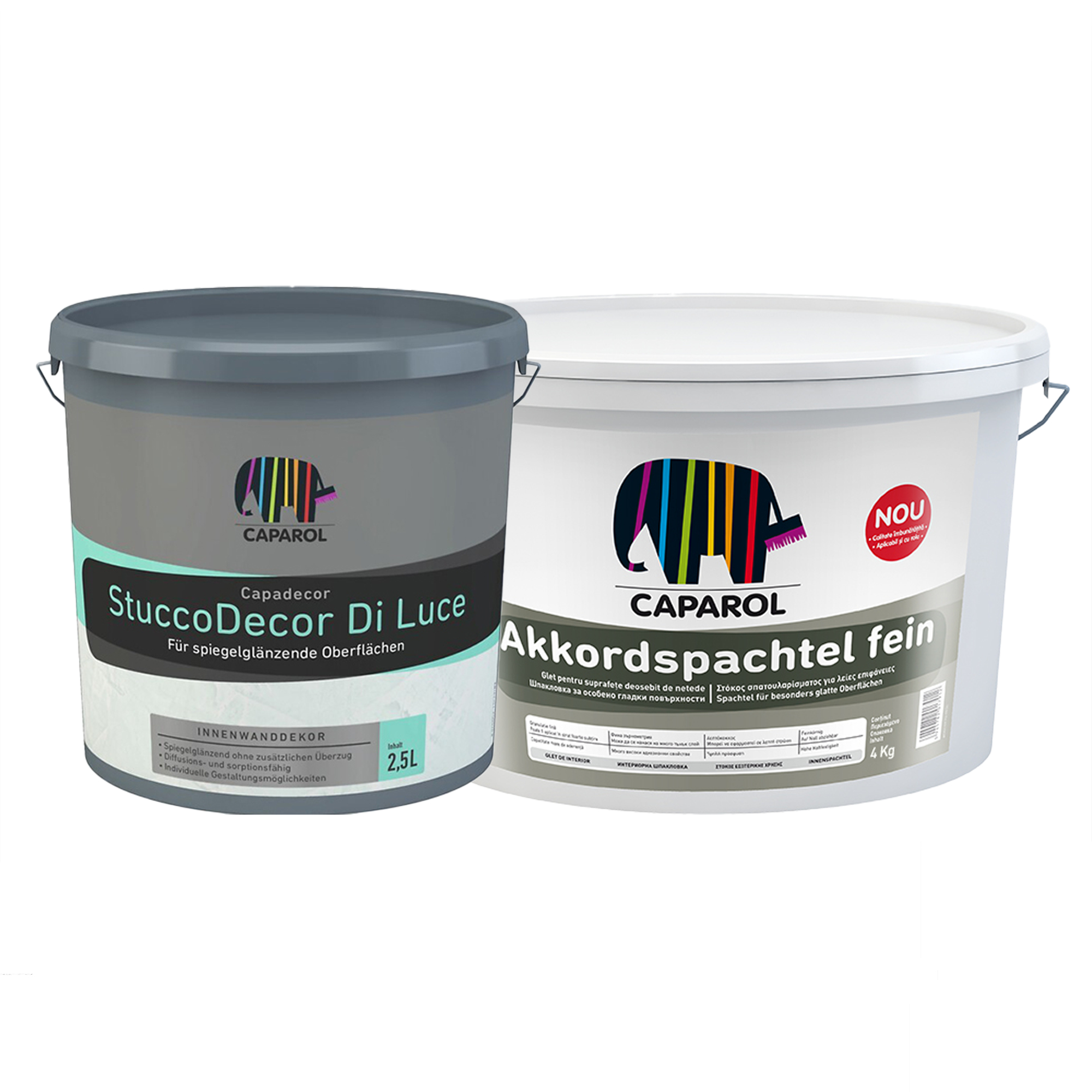 Masa de spaclu Capadecor StuccoDecor di Luce, alb, 2.5 l + Glet universal Caparol Akkordspachtel fein, interior, alb, 4 kg