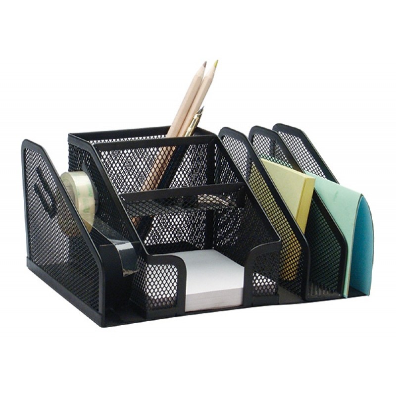 Organizer metalic Mesh, de birou, 6 compartimente+ suport banda adeziva, Q-Connect - negru