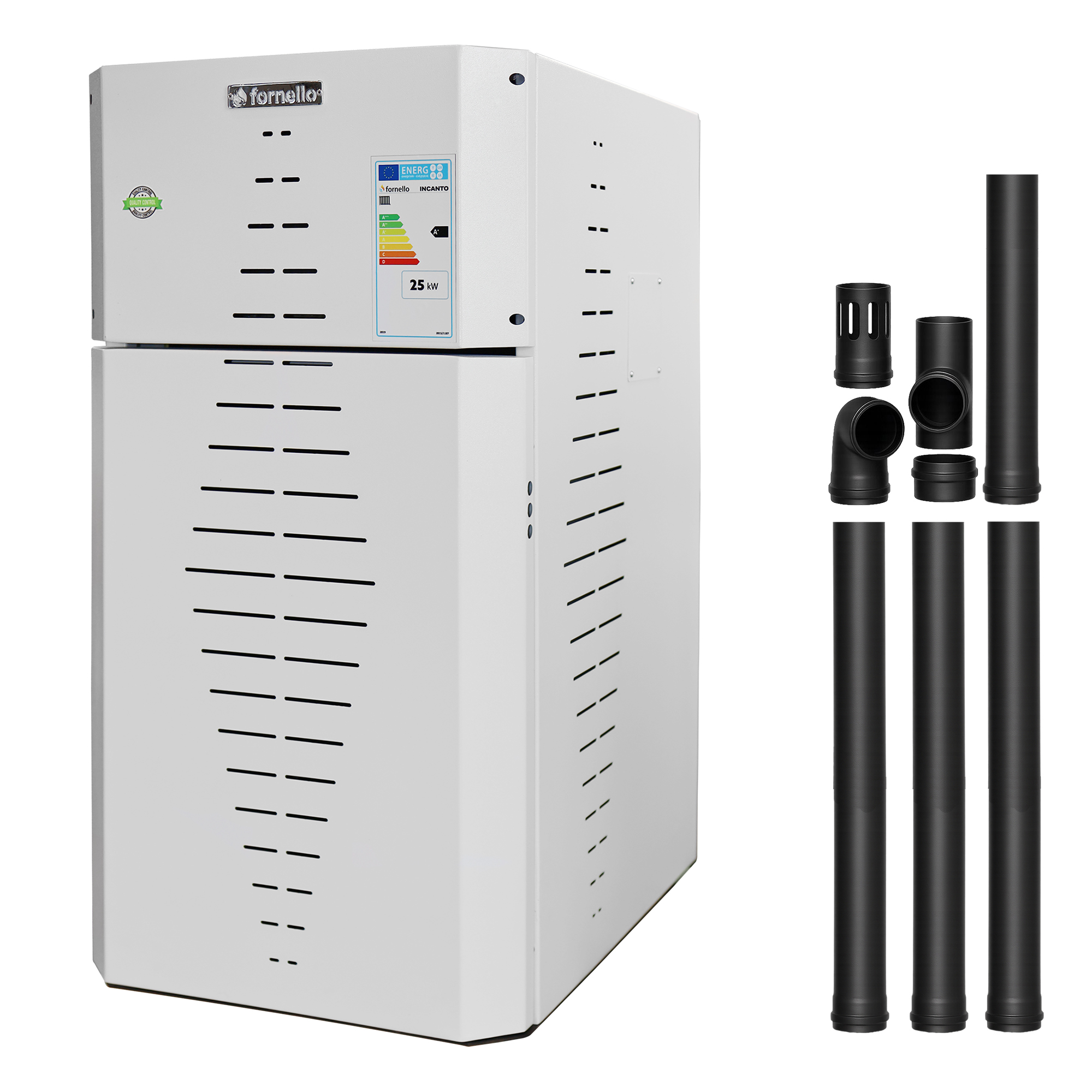 Pachet centrala pe peleti Fornello INCANTO COMPACT 25 kW pompa electronica vas expansiune arzator inox grup de siguranta kit evacuare 3.5 ml sistem de curatare MECANICA a creuzetului si drumurilor de fum culoare alb