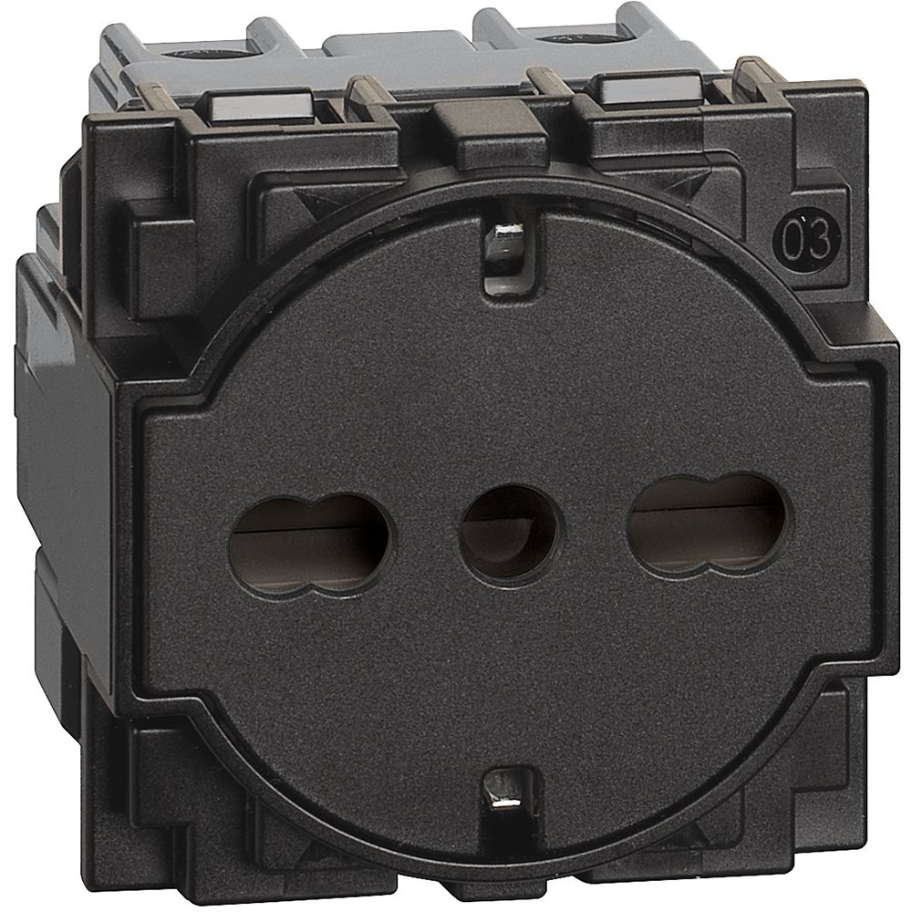 Priză plată standard germană și italiană. Când ștecherul este introdus, suprafața prizei alunecă în interiorul carcasei; acesta revine în p