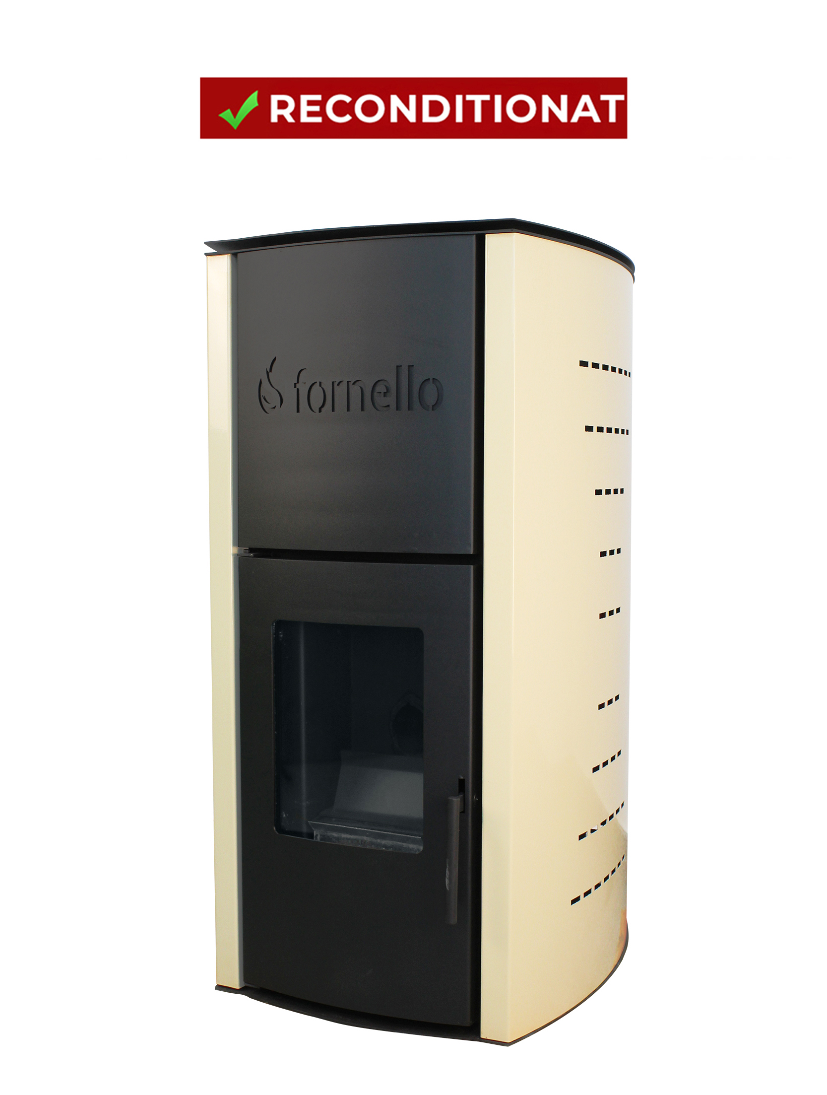 PRODUS RECONDITIONAT CU MICI LOVITURI IN PERFECTA STARE DE FUNCTIONARE 9005 !!! Termosemineu pe peleti Fornello Royal 18 kw complet echipat pentru incalzire pompa vas expansiune aprindere automata buncar peleti integrat culoare ivory