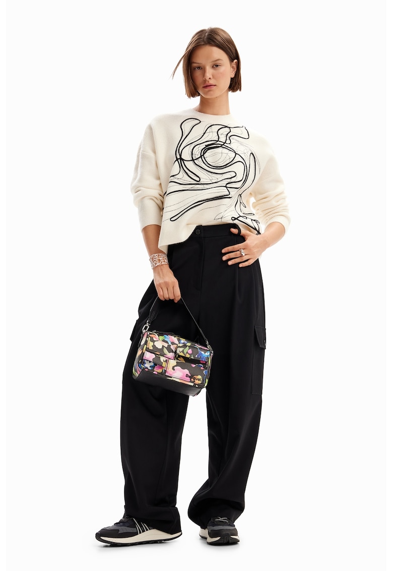 Pulover de bumbac cu maneci cazute - Negru stins/Alb murdar