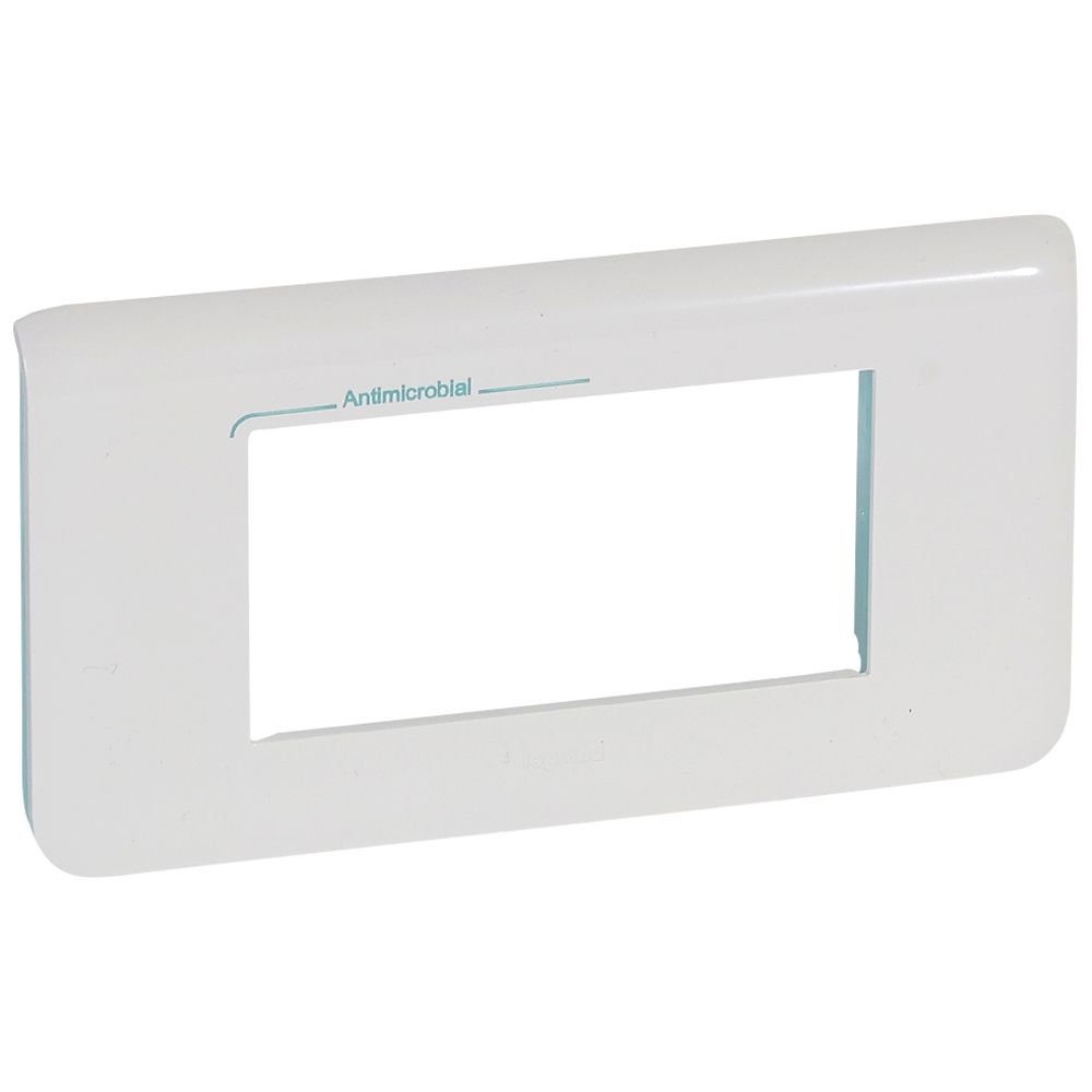 Rama antibacteriala pt. 4 module orizontale Legrand 078724. Contine un compus de argint pentru a preveni dezvoltarea bacteriilor pe rama.