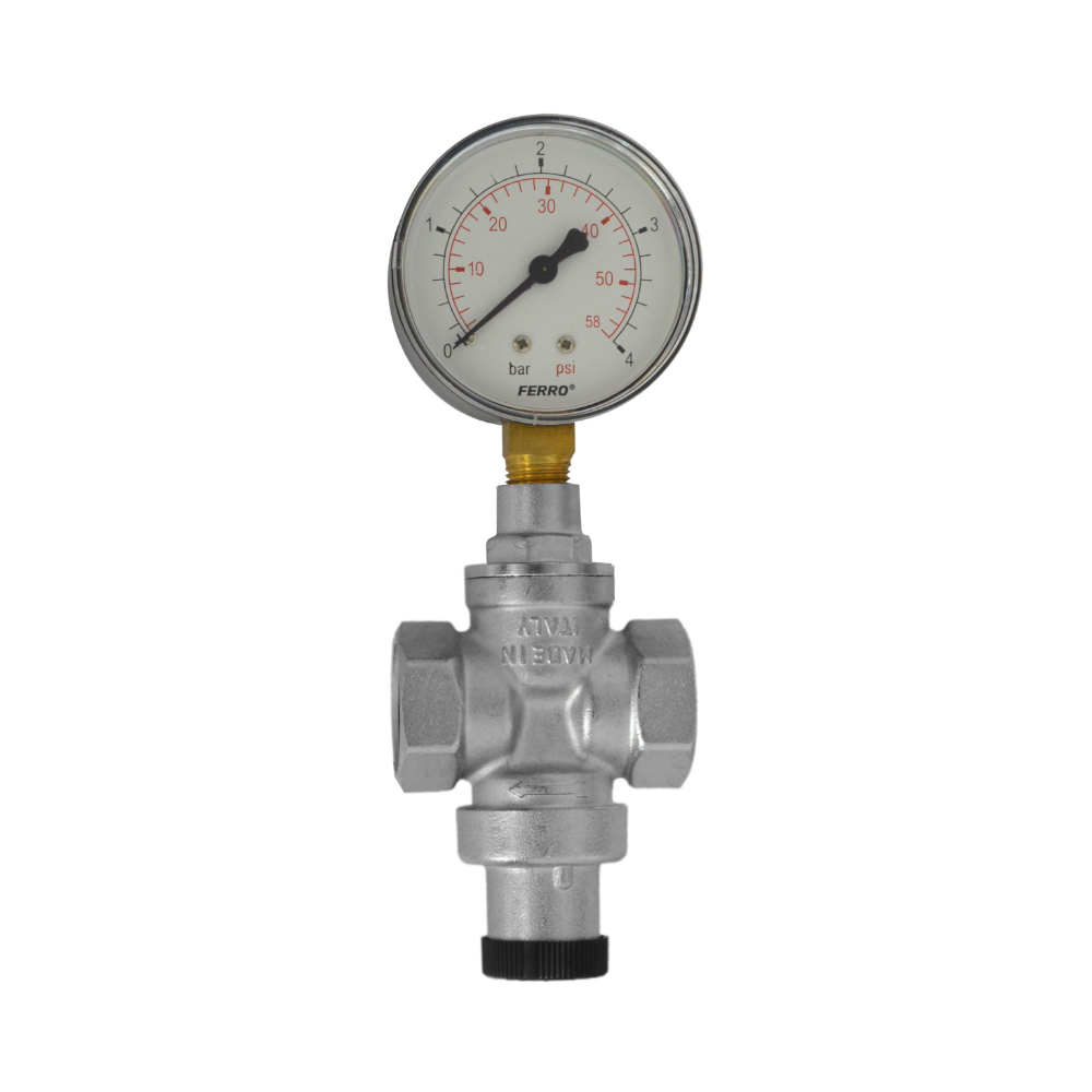 Reductorul de presiune argintiu Ferro cu racord cu manometru 1/2 se utilIzeaza pentru supravegherea si controlul presiunii in sistemele de apa. Il poti folosi si pentru instalatiile industriale sau comerciale. Temperatura maxima este de +80C, presiunea maxima este de 16 bar, iar presiunea de iesire ...