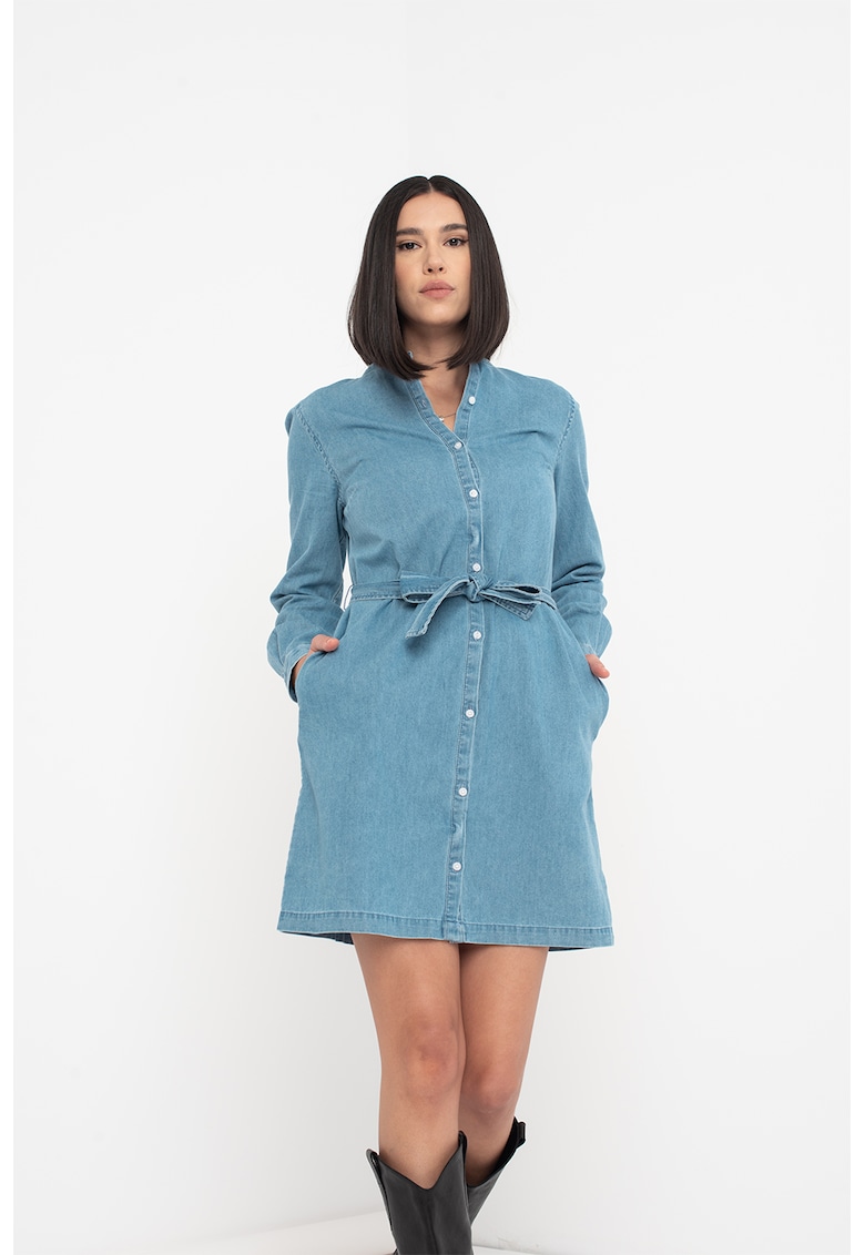 Rochie din material chambray cu cordon in talie - Albastru deschis