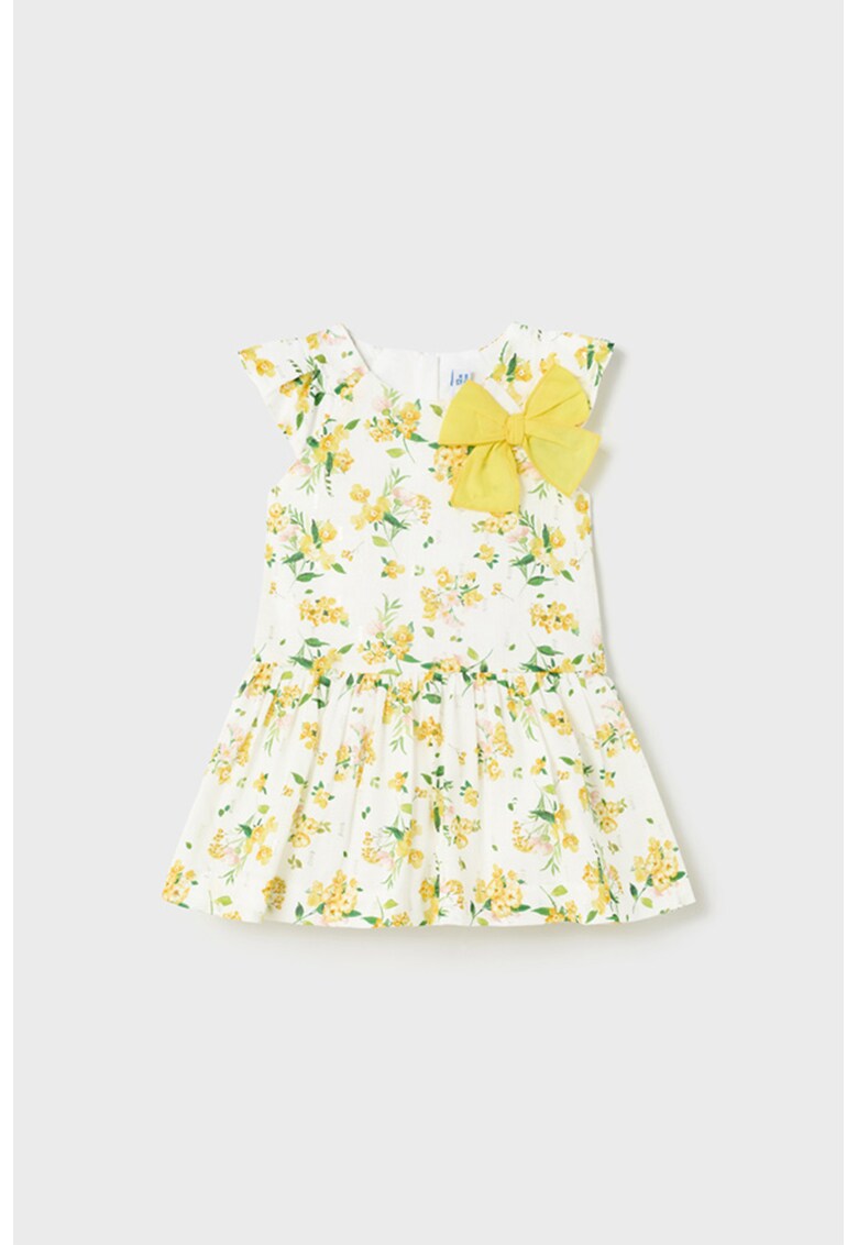 Rochie evazata cu model floral si aplicati funda - Alb/Galben