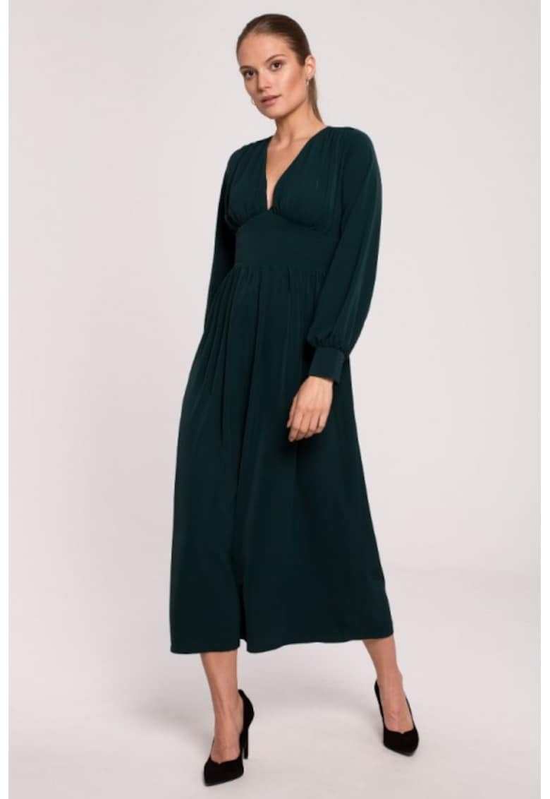 Rochie maxi cambrata in talie cu decolteu in V - - Verde