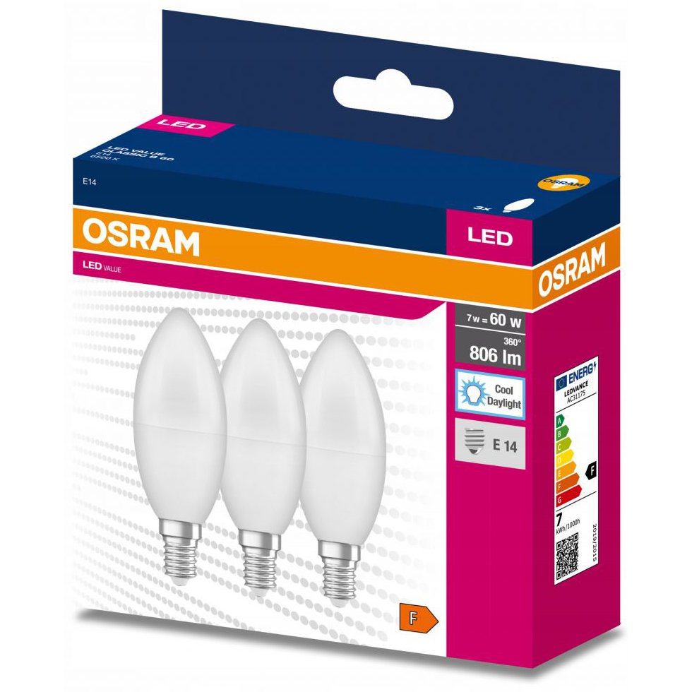 Set 3 becuri led lumanare 7.5W (60W), E14, B60, 806 lm, lumina rece (6500K), opal, Osram Osram 4058075385221