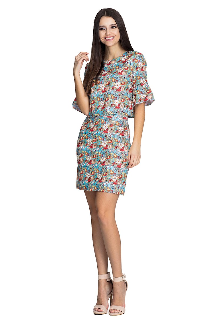 Set floral bluza cu maneci volane - fusta creion midi - poliester