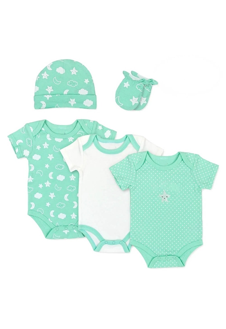 Set pentru bebelusi - 5 piese din bumbac - model stele si nori -  Alb/Verde menta