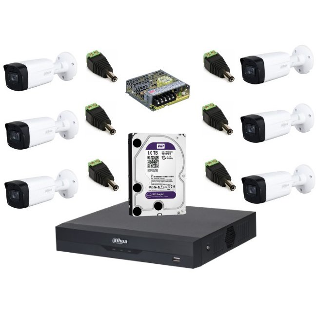 Sistem complet de supraveghere Dahua DH-6CEXT80M-5MPS HDCVI cu 6 camere de exterior de 5MP, IR 80m, Starlight, 16:9