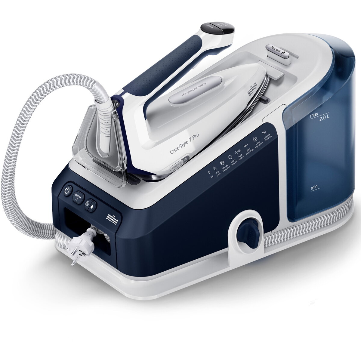 Statie de calcat Braun CareStyle 7 PRO IS7282BL, 2700W, 8 bari, abur variabil 180g/min, jet de abur 600g/min, rezervor detasabil 2L, tehnologie iMode, tehnologie iCare, tehnologie FreeGlide, talpa EloxalPlus, sistem Ultimate FastClean, albastru