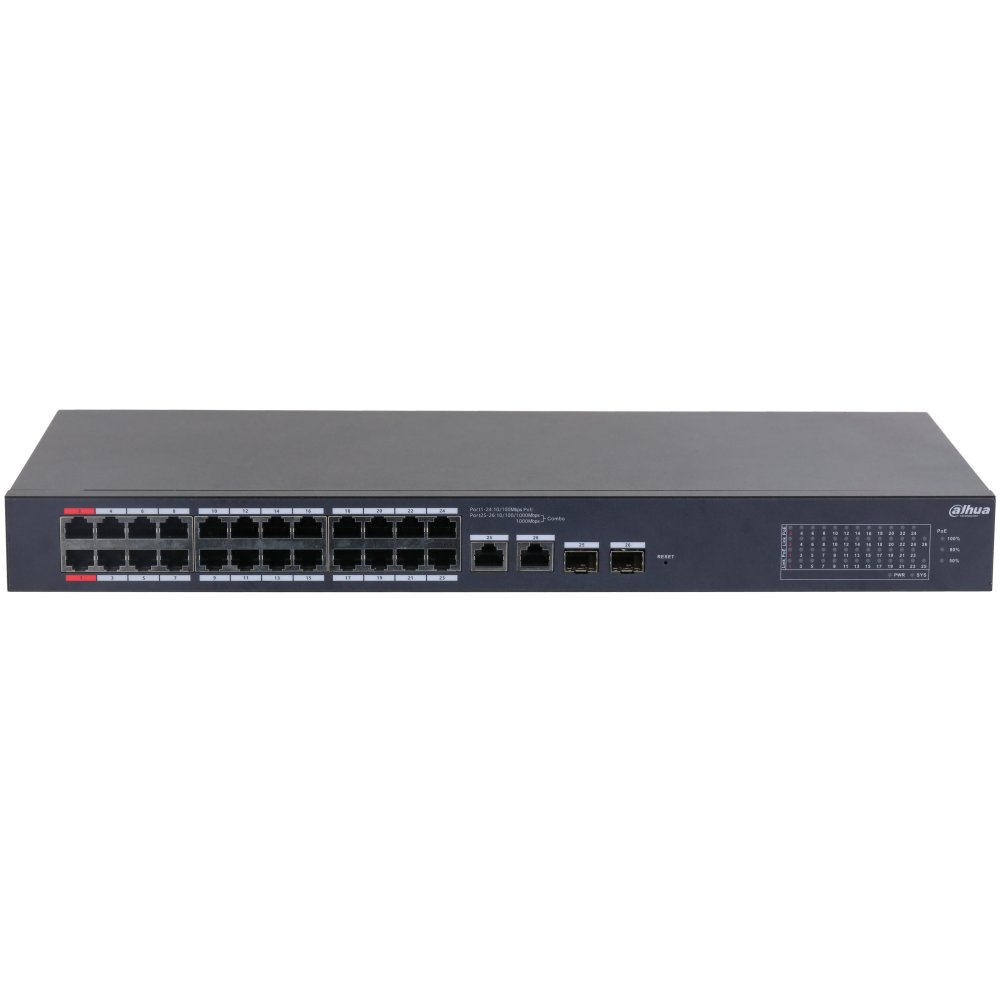 Switch 24 porturi PoE cloud management Dahua CS4226-24ET-375, 2 porturi RJ45 si SFP, PoE Watchdog. Porturile RJ45 si SFP nu pot fi folosite simultan.