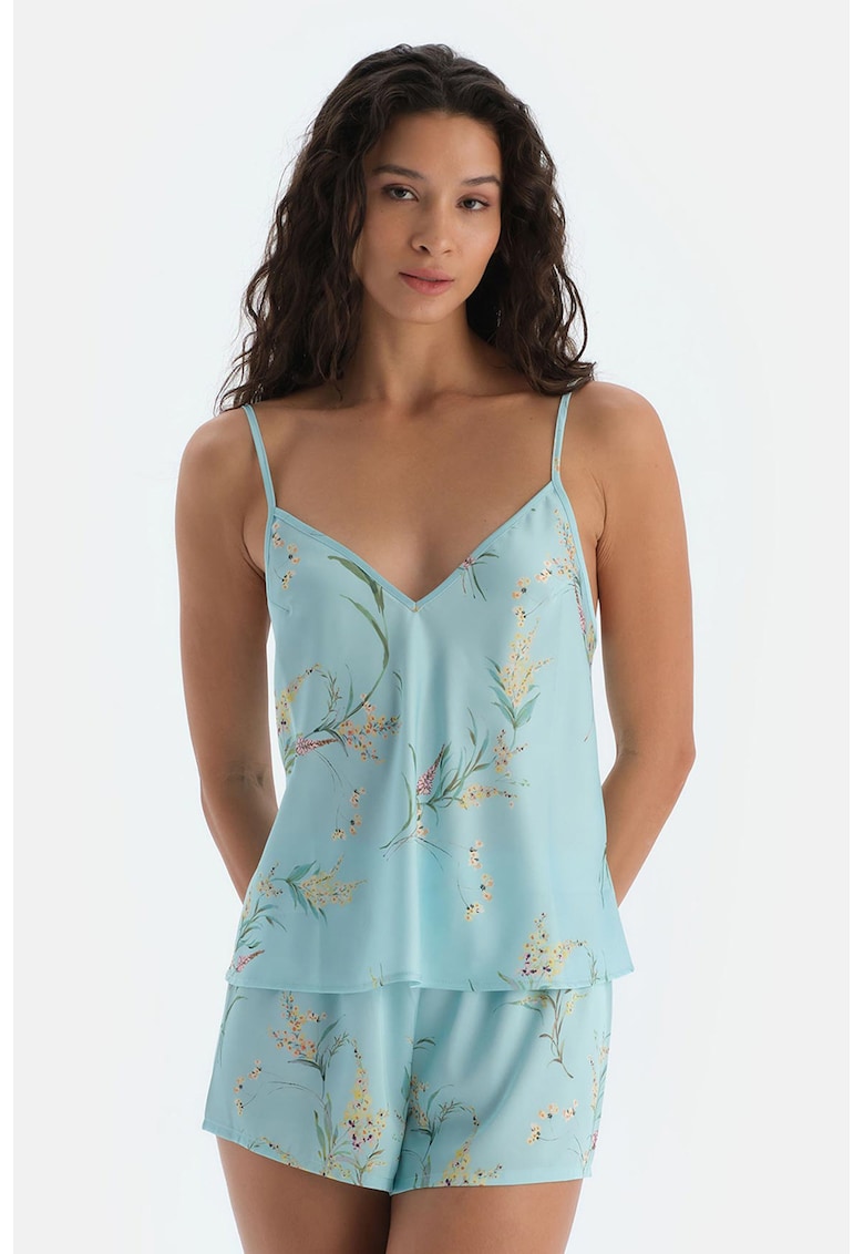 Top de pijama din satin cu model floral - Albastru aquamarin
