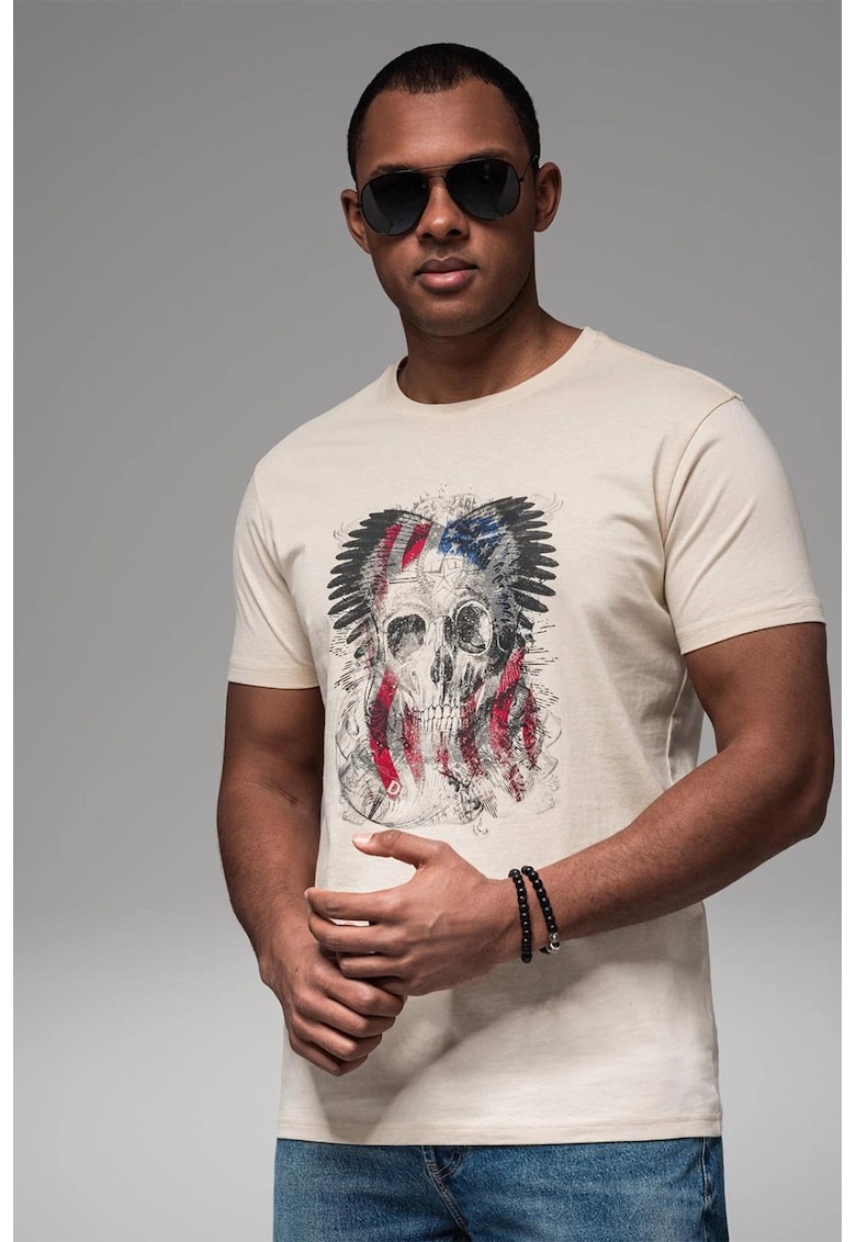 Tricou cu imprimeu si decolteu la baza gatului - Rosu/Negru/Crem