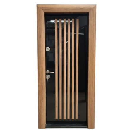 Usa metalica de apartament cu izolatie si vizor Novo Doors First Class NDS45, Deschidere Stanga Dreapta, Dimensiune 200X88 cm, Tabla 1.2 mm, Negru lucios cu riflaj MDF Stejar (Sens deschidere: Dreapta)