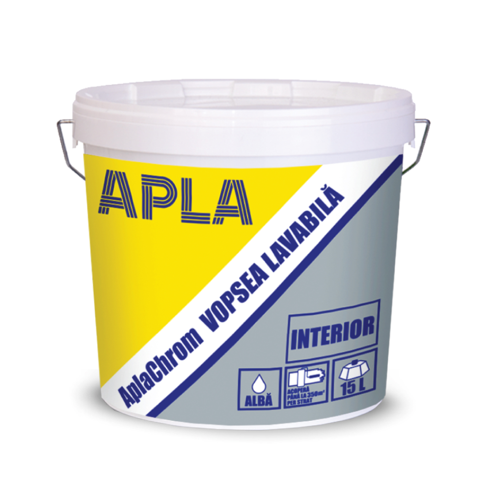 Vopsea lavabila Apla Chrom pentru interior pe baza de copolimeri acrilo-stirenici in dispersie apoasa, pigmenti, materiale de umplutura, aditivi prezinta o aplicabilitate buna, are putere mare de acoperire si aderenta la suportul pregatit corespunzator. Produsul realizeaza pelicule cu grad de alb ri...