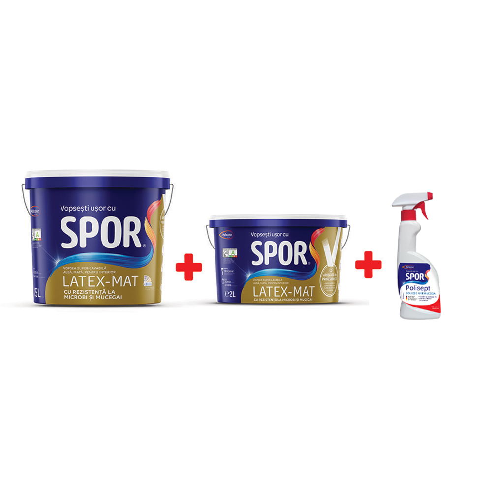 Vopsea super-lavabila interior, Spor latex-mat, alba, 15 l + 2 l + solutie antimucegai Spor Polisept