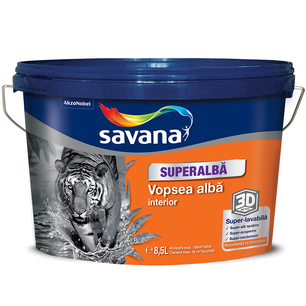 Vopseaua superlavabila Savana ofera protectie si finisare decoativa peretilor interiori si tavanelor realizate din gleturi, gips carton, tencuieli de var si ciment, beton si alte suporturi minerale. Acest produs are culoarea alb si se poate nuanta folosind Savana colorant superconcentrat pentru vops...